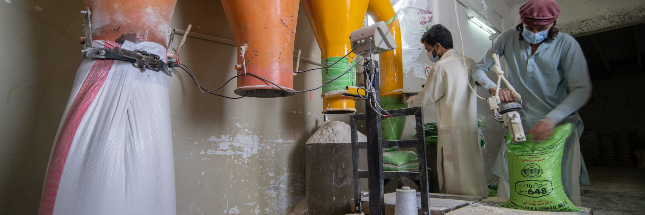 A flour mill in Pakistan, where wheat flour is fortified with essential vitamins and micronutrients. Wheat flour is a household staple in the country.